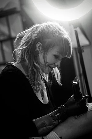 Robin is originally from Germany and moved to Vancouver in April 2025. She spent 10 years working in tattoo studios in management and as a piercer before getting the opportunity to start tattooing. She’s still at the beginning of her tattoo career, but from day one she’s been fully dedicated to dotwork.